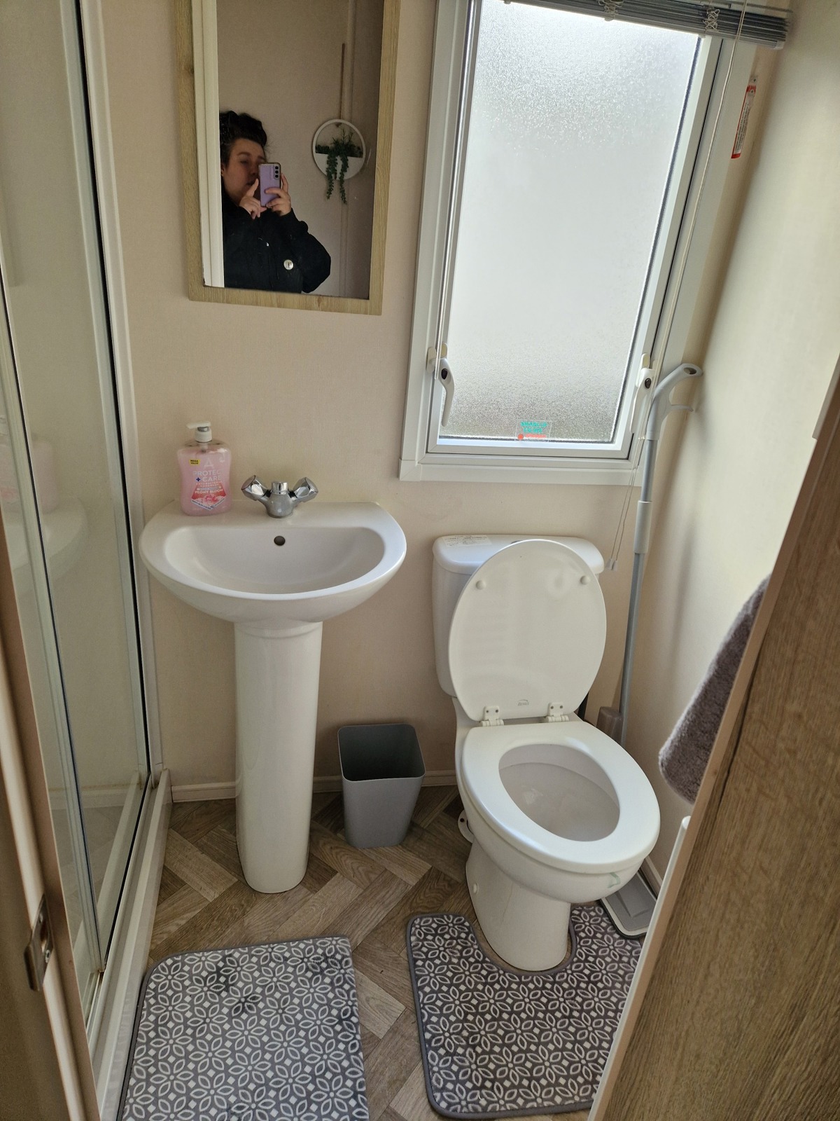 Separate shower room with shower, WC, and sink with mirror